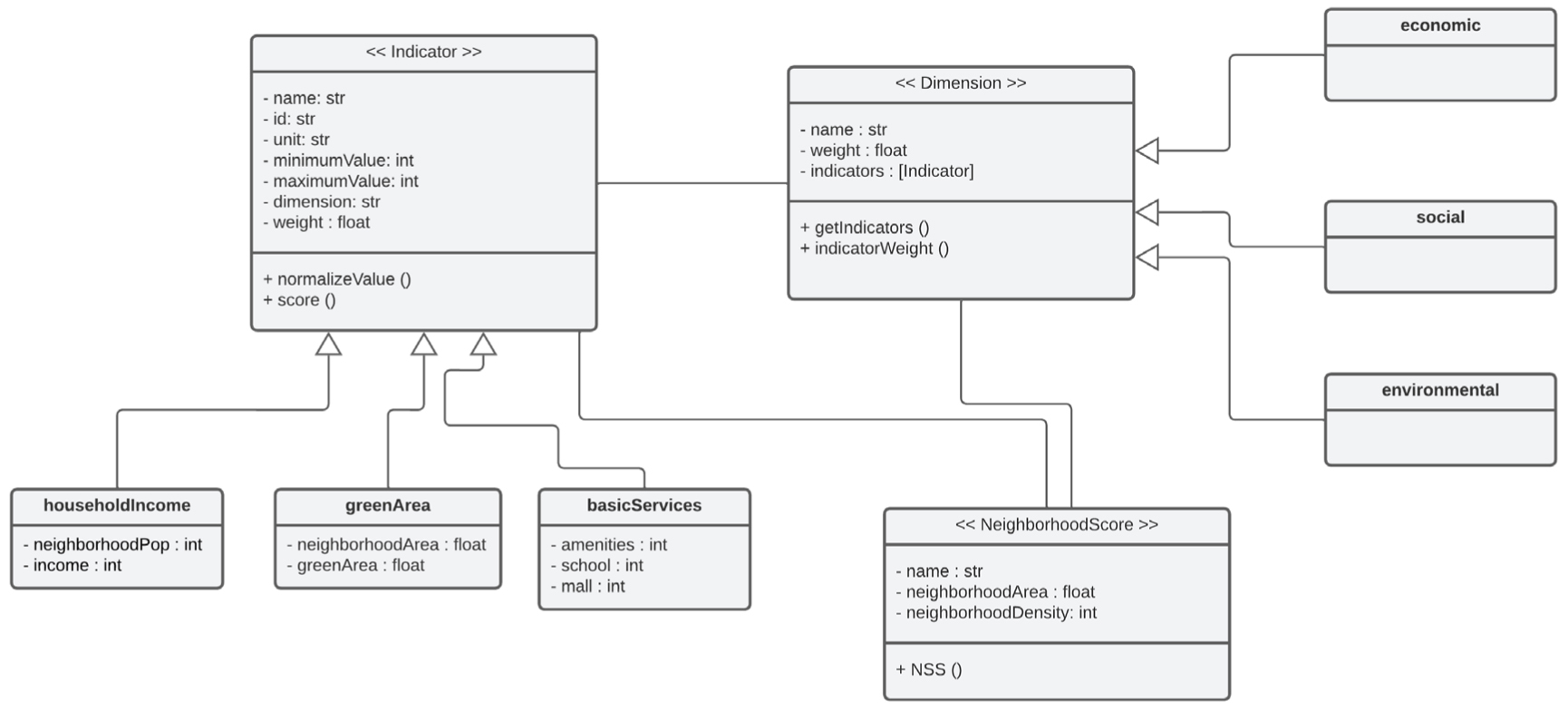 A sustainability assessment framework for urban neighborhoods was developed in this research. This framework is based on indicators in each dimension of sustainability and their relationship. The method is developed in a way that it could be applied to various cities. Dimensions of sustainability have equal weights and are assessed through a set of indicators. Considering the objectives, agenda, and data availability of cities, indicators could be added or eliminated. The UML diagram of the model is presented in Figure 1. The model relies on classes, sub-classes and their relationship. In this model, the variable’s data type is either qualitative, represented as a string (str), or quantitative, shown as an integer (int) and float.