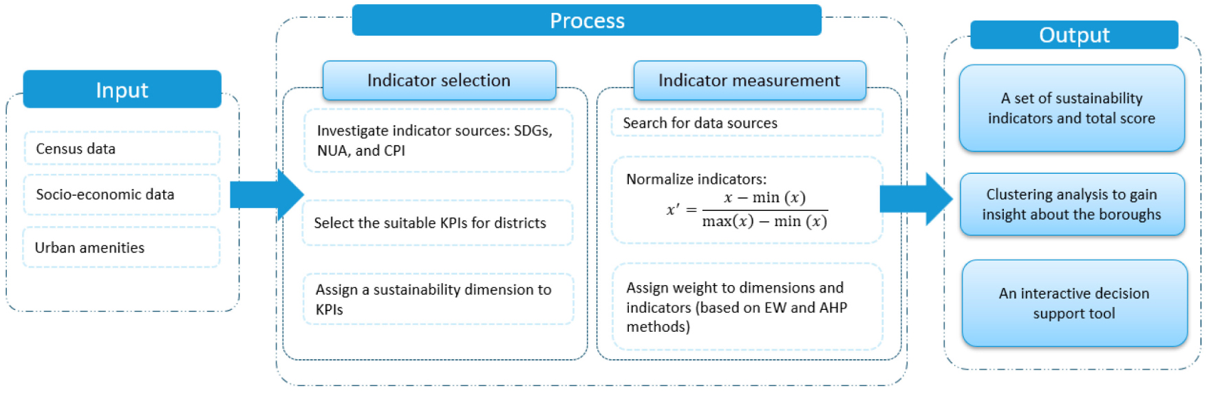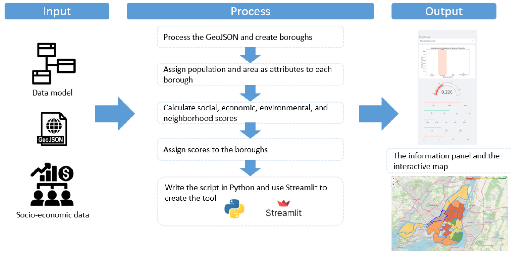 An interactive decision support tool provides an interface for decision-makers to visualize, analyze, and gain insight into sustainability performance. Since the calculation is based on the neighborhoods performance, a map can best visualize the interested boroughs and illustrate various statistics. To serve this purpose, a GeoJSON file of the neighborhoods is needed. This file contains the latitude, longitude and other information of the boroughs. Calculated indicators and other characteristics of the locations are gathered following the UML diagram in Figure 1. A Python script was developed to process input data based on the UML diagram and output the interactive map. To create the application, the Streamlit library has been used, which is a Python library for creating interactive web applications. The Figure 3 shows the process of creating the visualization tool.