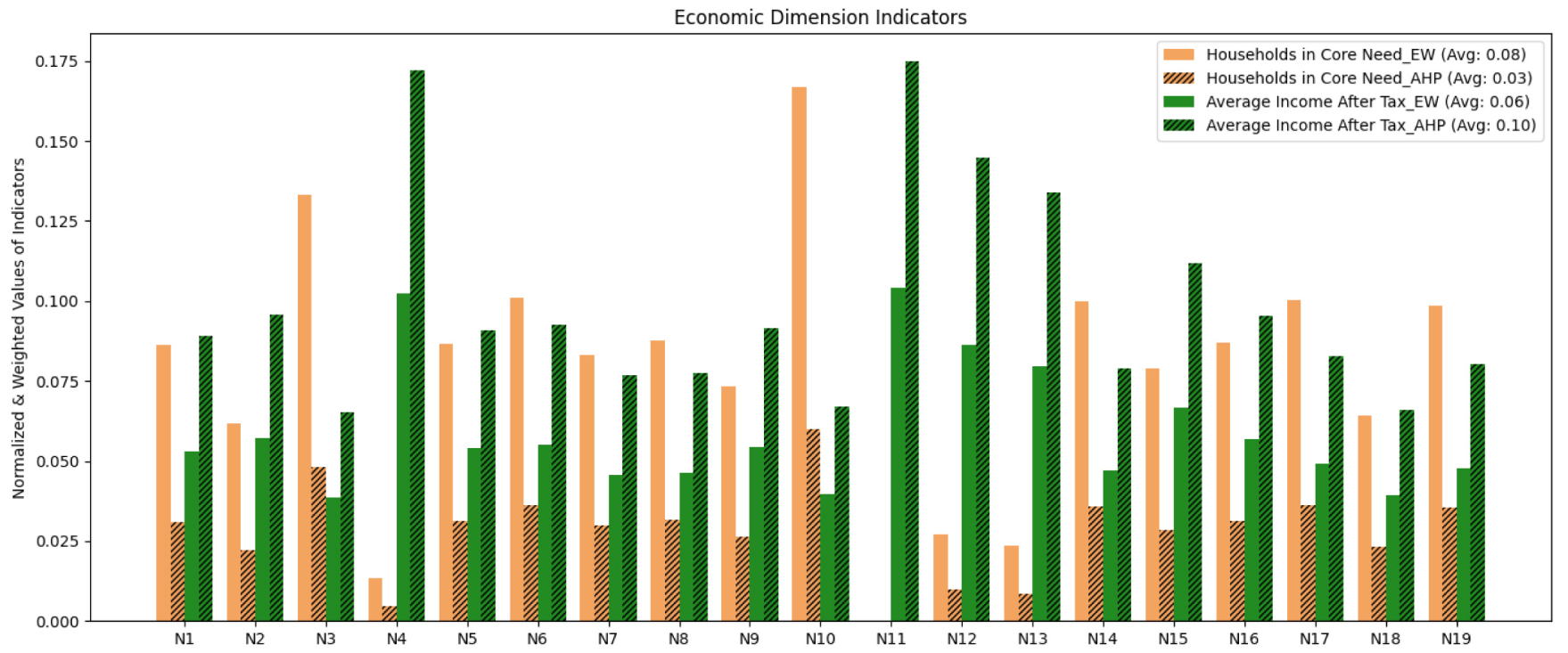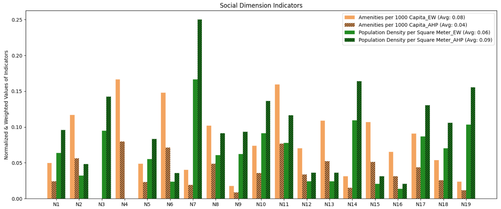 In the AHP method in environmental sustainability, more weight is given to EN1. Therefore, green area per capita has a higher impact on NSS. For example, N4 and N17 stand out more in the AHP method due to their larger green areas. This demonstrates that the AHP method considers the importance of the presence of green spaces, which results in more environmentally sustainable boroughs. In the EW method, the average value of EN1 and EN2 are equal, whereas in the AHP method, EN1’s average is increased by 0.3, and EN2’s average is decreased by 0.3.