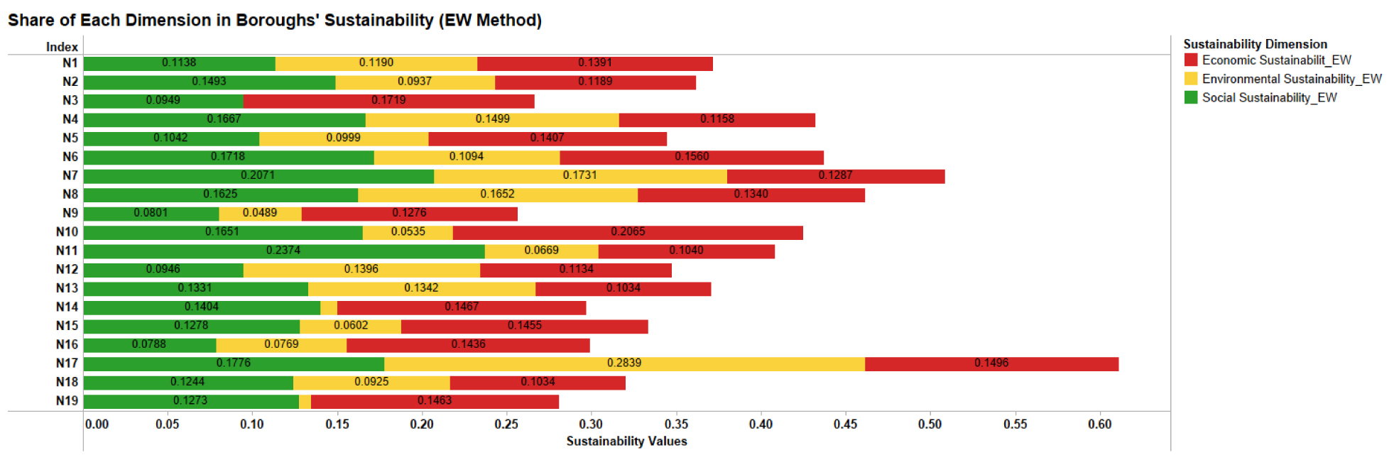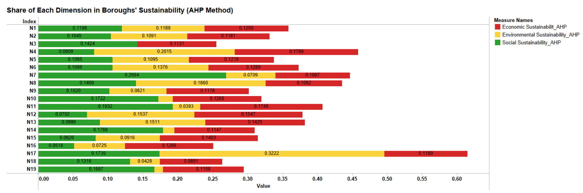 The charts in Figure 7 and Figure 8 present the share of each sustainability dimension in the NSSEW and NSSAHP, respectively. In both cases, N17 has the highest score and a similar dimensions distribution. The main contributing dimension is environmental sustainability due to the large amount of green spaces and availability of bike lanes. The EW method assigns equal importance to indicators which results in a balanced distribution across the boroughs.