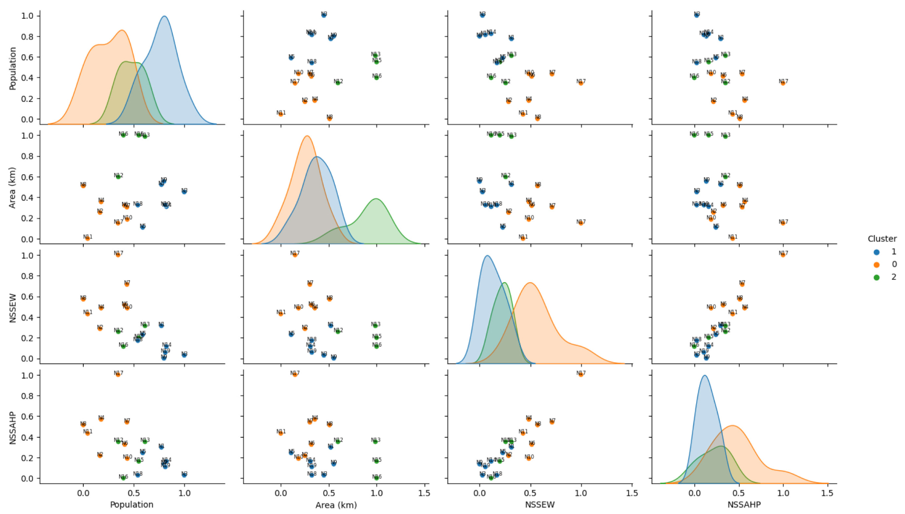 Density plots, which are presented diagonally, show the distribution of clusters for each feature. Pairwise comparison of clusters for features population versus NSSEW and population versus NSSAHP shows similar patterns. Population-dense boroughs, cluster one, have the lowest overall score than the less populated areas (cluster 0). Plots presenting area versus NSSEW and NSSAHP follow a pattern similar to that of the population. The trend between the population and area with the overall score (either EW or AHP) depicts a negative correlation.