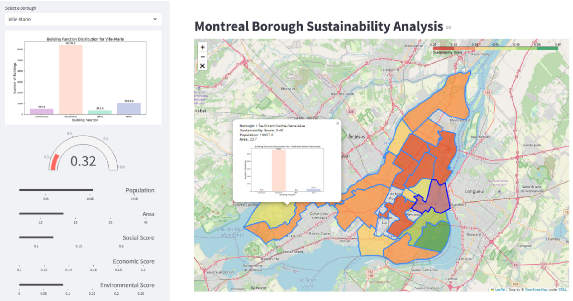 Results indicate the neighborhoods’ sustainability performance in terms of their sustainability score. Findings reveal that borough N17 had the highest score due to the vast green spaces and accessible amenities. On the other hand, boroughs N3 and N9 represent a cluster of boroughs with low performance, highlighting the need for investment and improvement in different aspects, such as increasing green and public spaces. The results can help the decision-makers set strategic goals, address the existing challenges, and implement targeted actions to improve neighborhood sustainability. The visualization tool illustrates key sustainability results and features, for instance, the NSS, population, area, and the distribution of the buildings in Montreal boroughs.
