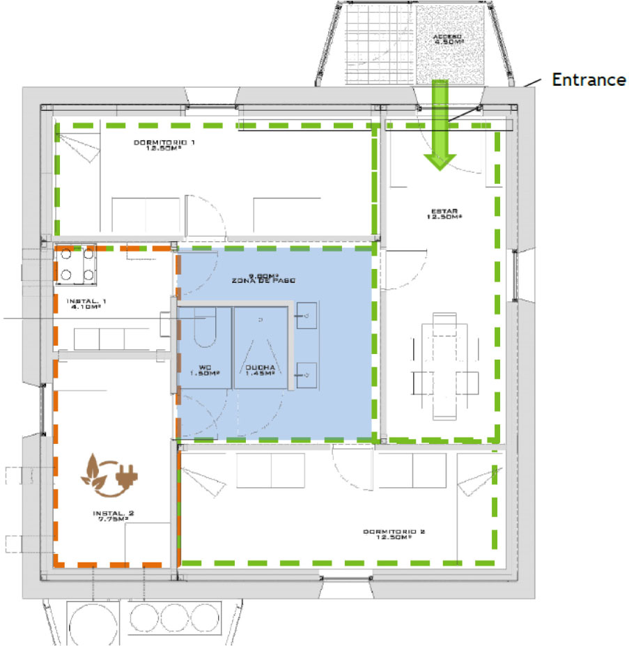 Finally, it must be noted that the module requires 90% less energy than existing modules, thanks to the high level of thermal insulation of Passivhaus standards. It is self-sufficient, as the module generates and stores the little energy it needs to operate. Figure 2 shows the scheme of the energy systems.