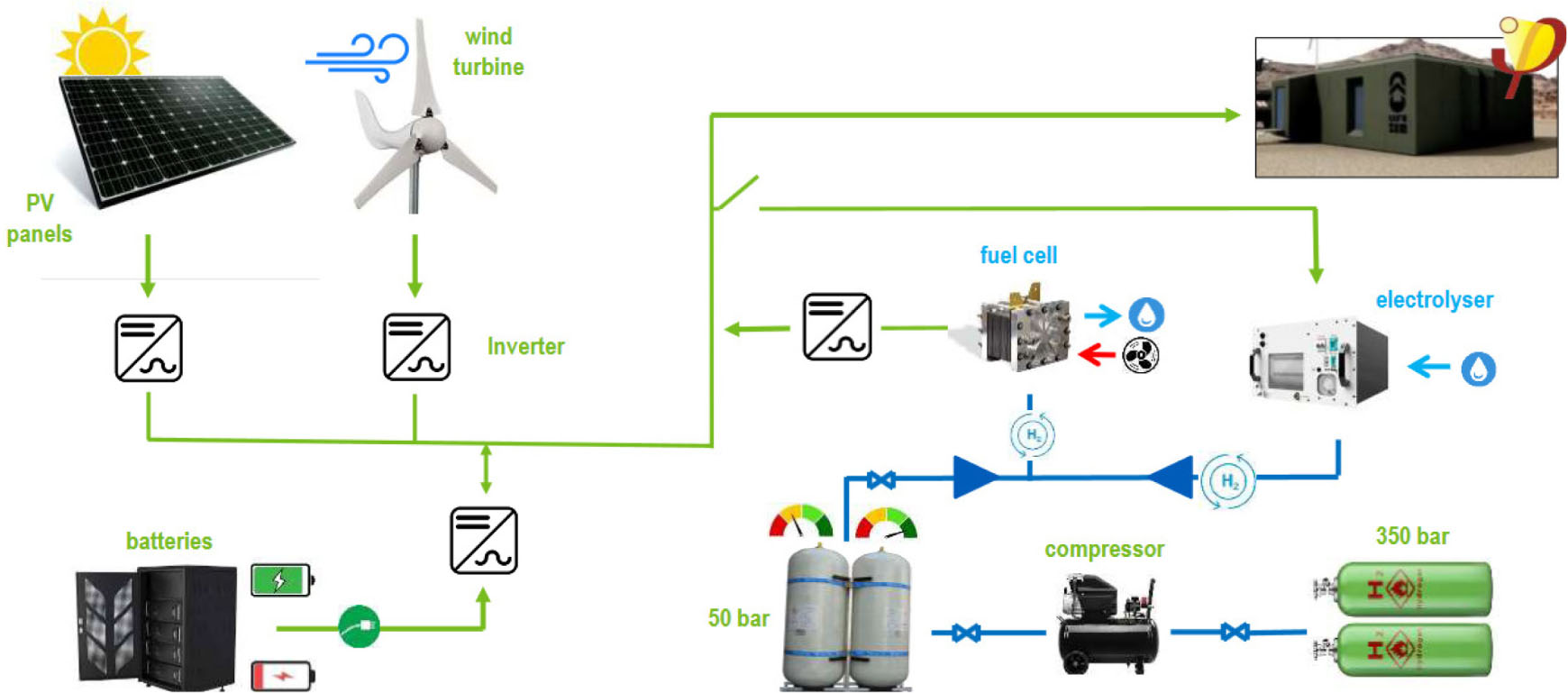 Since this construction is designed to operate in remote areas in an energy self-sufficient way, it has its own power generation system using solar photovoltaic modules (5.4 kWp) and small wind turbine (3 kW). In addition, lithium-ion batteries (LiFePO4 with 14.4 kWh) and a hydrogen generation, storage and use system are available for energy storage. It is also highlighted that a controlled mechanical ventilation system provides air conditioning with enthalpy recovery powered by aerothermal energy.