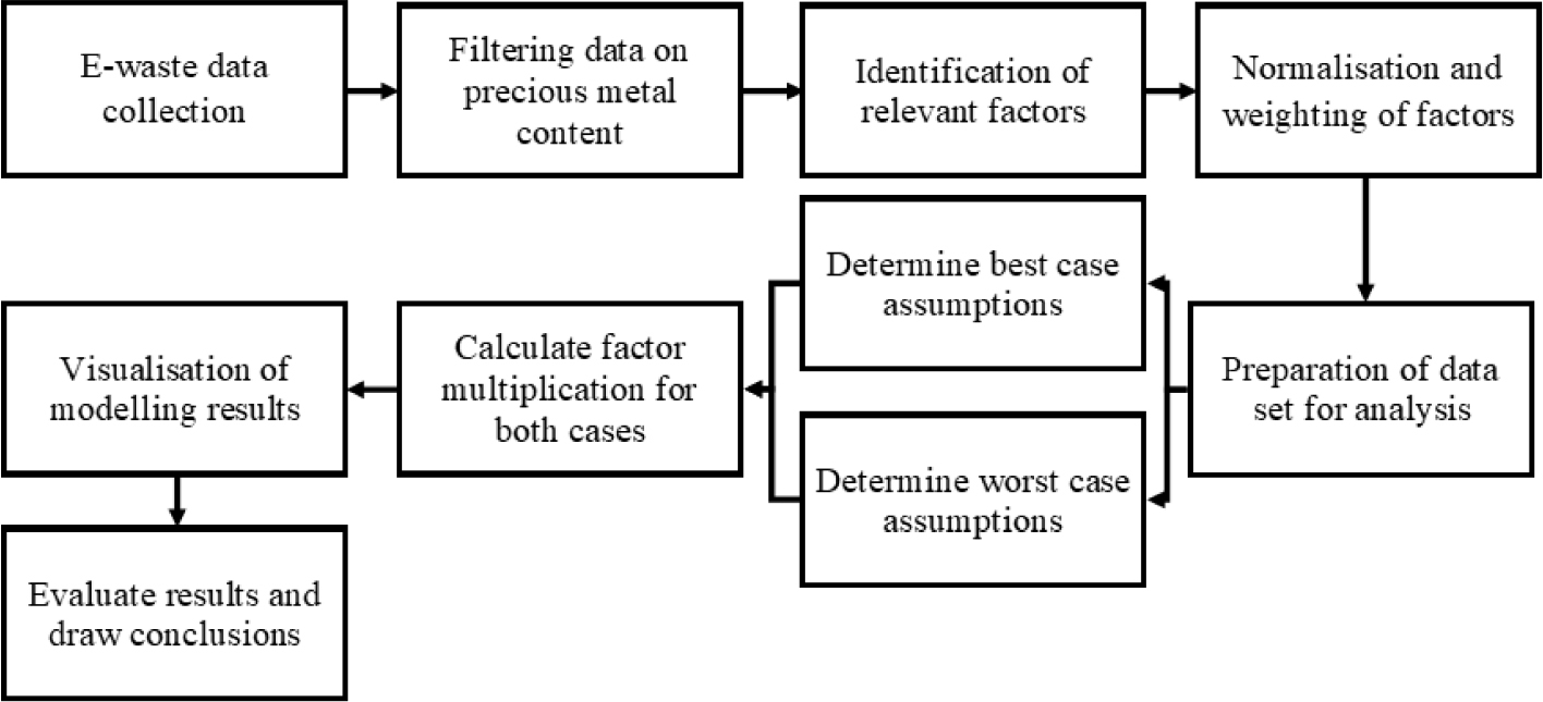 The aim of the current research is to assess the potential for precious metals recovery using theoretical potential information on urban mining processes. A significant volume of data from various sources on a broad spectrum of WEEE was analysed in the paper. This paper will analyse data by first compiling comprehensive information on the performance of diverse urban mining techniques employed for recovering precious metals. This entails calculating fundamental statistical measures, such as the mean and standard deviation, regarding the recovery rates, and conducting comparative analyses to identify the most effective methodologies. To evaluate the theoretical potential for recoverable resources, the investigation will estimate the total quantity of precious metals that could potentially be extracted from various waste sources by theoretical models and scenario analyses (Figure 1).