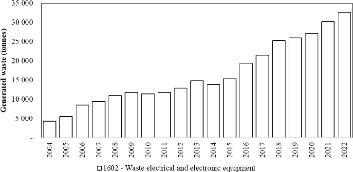 Time series of waste generation classified as “1602 - Waste electrical and electronic equipment” in Hungary (t, 2004-2022)