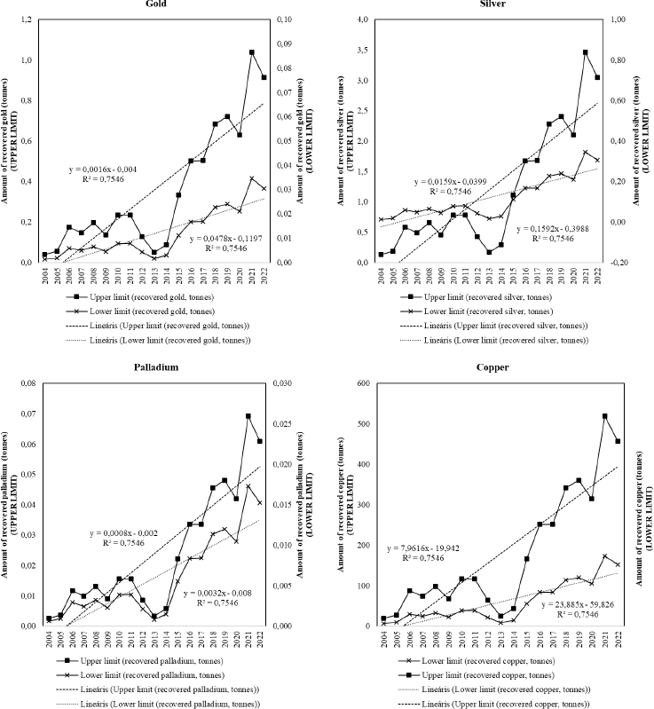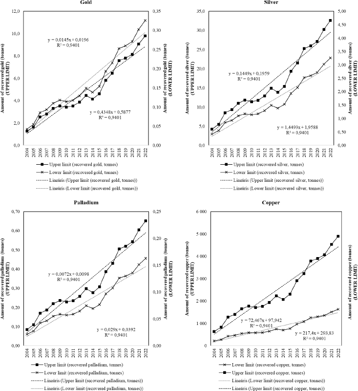 In contrast, for silver, an interval between 2.27 t (lower value) and 22.7 t (upper value) could be defined. The lower value of palladium was marked as 0.11 t, while the upper value was 0.45 t. The largest potential, as expected, was calculable in the case of copper. The magnitude of the lower value ranged from 1,133.8 t between 2004 and 2022, while the upper value measured 3,401.4 t.