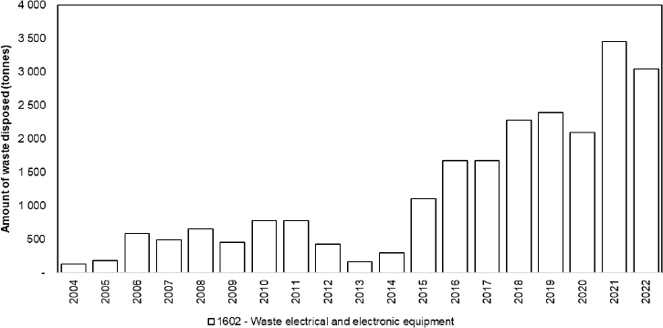 Time series of waste disposed as “1602 - Waste electrical and electronic equipment” in Hungary (t, 2004-2022)