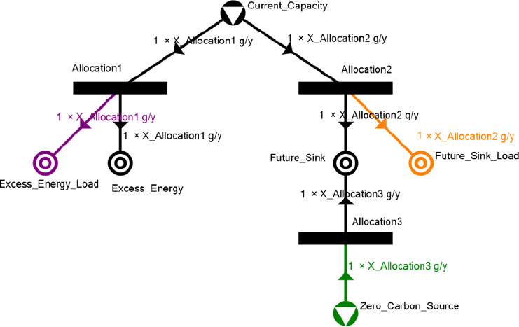 For the model in Figure 3, a CMN with one source (current capacity) and one sink (future demand) is shown. The energy source (represented by ‘raw material’ note) is linked to future demand and excess energy (both are ‘product’ note). Note that the future demand sink is also linked to an external carbon-neutral source (‘raw material’ note), which is used to determine the minimum future demand of renewable energy. Note that two ‘product’ notes are used to present fictitious load sinks that are not present in the actual process flow but refer to emission limits of future demand. The ratio of the ark is the CO2 intensity of the source, which is used for calculating the CO2 load between the sources and sinks. The allocation units (‘operating units’) between the sources and sinks are used for determining the amount of energy sources to be sent to the sinks.