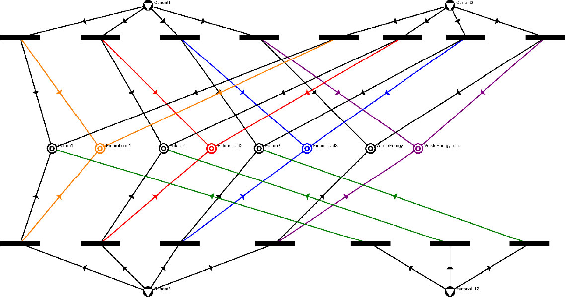 Any problem that can be mapped into an equivalent PNS problem can be solved with P-graph. For example, Tan et al. [14] showed that the source-sink matching problem often encountered in Process Integration can be expressed in PNS form, including the examples in [28] and [29]. Since it has previously been established that the electricity trading problem can be framed as a source-sink matching problem [5], it logically follows that it can also be solved with P-graph. This work also capitalizes on the PNS-like structure of regional electricity trading [28],[29] as well as the flow of embodied GHG emissions. Figure 3 shows the CMN structure adopted from Tan et al. [14] for regional electricity trading in this work, where sources represent current capacity, and sinks represent future demand. This model is flexible enough and can be applied to any regions that share the same source-sink principle.