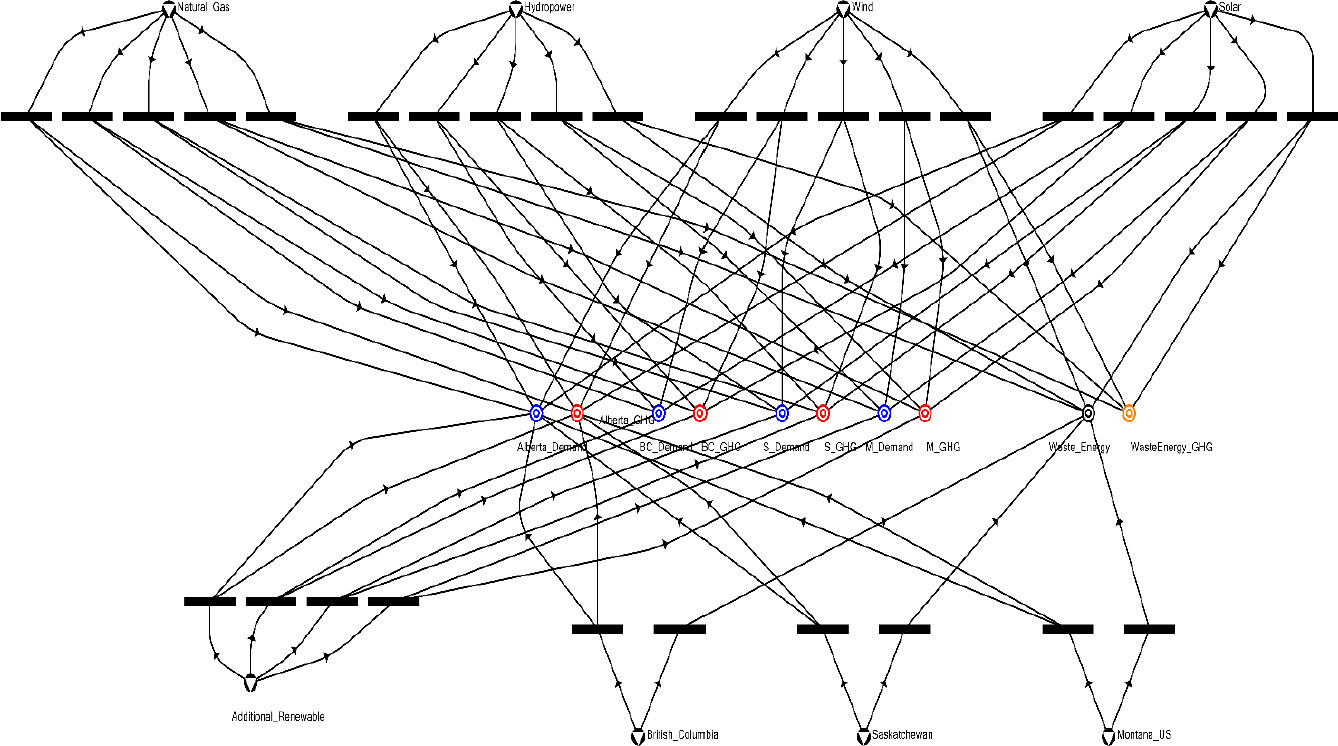 Lastly, Scenario 3 evaluates the need for nuclear power to meet the model's targets if Alberta decides to incorporate nuclear technology into its power generation. This is considered in the P-graph model by adjusting the GHG intensity of the additional resource to be 29 t- CO2-e/GWh, equivalent to that of nuclear power generation. Table 26 shows the electricity generation of Alberta by source with respect to three different feasible solutions. Table 27, Table 28 and Table 29 show the exports of Alberta by resource for feasible solutions 1, 2 and 3 respectively. To meet the model's targets, a minimum of 36,253.17 GWh/y of electricity from nuclear resources is required.